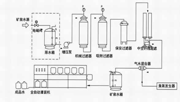 純凈水/礦泵水工藝流程 礦泉水廠生產(chǎn)工藝流程圖: 純凈水/礦泉水廠生產(chǎn)工藝流程(圖): a) 原水泵 主要功能:恒定系統(tǒng)供水壓力,穩(wěn)定供水量 b) 機(jī)械過(guò)濾器 采用多次過(guò)濾層的過(guò)濾器,主要目的是去除原水中含有的錳、鐵重金屬、泥沙、鐵銹、膠體物質(zhì)、懸浮物等顆粒在20um以上的物質(zhì),系統(tǒng)可以進(jìn)行反沖洗、正沖洗等一系列操作。 主要功能:保證設(shè)備的產(chǎn)水量,延長(zhǎng)設(shè)備的使用壽命。 c) 活性炭過(guò)濾器 采用果殼活性炭過(guò)濾器,活性炭不但可吸附電解質(zhì)離子,還可以進(jìn)行離子交換吸附。經(jīng)活性炭吸附還可使高錳酸鉀耗氧量(COD)由15mg/L(02)降至2-7mg/L(02),此外由于吸附作用使表面被吸附復(fù)制的濃度增加,因而還起到催化作用,去除水中的色素、異味、大量生化有機(jī)物、降低水的余鹵值及農(nóng)藥污染物和除去水中三鹵化物(THM)以及其他的污染物。系統(tǒng)可以進(jìn)行反沖洗、正沖洗等一系列操作。同時(shí),設(shè)備具有自我維護(hù)系統(tǒng),運(yùn)行費(fèi)用很低。 主要功能:保證設(shè)備的產(chǎn)水質(zhì)量,延長(zhǎng)設(shè)備的使用壽命 d) 軟化系統(tǒng) 為防止?jié)馑颂貏e是RO裝置最后一根膜組件濃水側(cè)出現(xiàn)CACO3,MGCO3,MGSO4,CASO4,BASO4,SRSO4,SISO4的濃度大于其平衡溶解度常數(shù)而結(jié)晶析出,損壞膜原件的應(yīng)有特性,在進(jìn)入反滲透膜組件之前系統(tǒng)采用鈉型陽(yáng)離子交換樹(shù)脂,進(jìn)行離子交換吸附,去除水中主要硬度成分,吸附飽和后,樹(shù)脂失效,可用工業(yè)用鹽進(jìn)行再生樹(shù)脂,使之恢復(fù)交換能力。 每套軟化系統(tǒng)包括:軟化罐、控制器(或射流器/鹽泵)、鹽箱及鹽閥 主要功能:防止反滲透摸結(jié)垢,延長(zhǎng)反滲透膜的使用壽命 e) 精密過(guò)濾器 精密過(guò)濾器用來(lái)截留預(yù)處理系統(tǒng)漏過(guò)的少量機(jī)械雜質(zhì)。過(guò)濾器筒體采用工程塑料或SUS304材質(zhì);內(nèi)裝PPF濾芯。聚丙烯濾芯是一種效率高、阻力小的深層過(guò)濾元件。適用于含懸浮雜質(zhì)較低(濁度小于2-5度)的水進(jìn)一步凈化。聚丙烯濾芯由聚丙烯纖維按一定規(guī)律纏繞在注塑聚丙烯多孔管上形成。主要功能:保證進(jìn)入反滲透膜的水顆粒度小于0.1um f) 反滲透系統(tǒng) 反滲透裝置是用足夠的壓力使溶液中的溶劑(一般是水)通過(guò)反滲透膜(或稱(chēng)半透膜)而分離出來(lái),因?yàn)檫@個(gè)過(guò)程和自然滲透的方向相反,因此稱(chēng)為反滲透。 反滲透法能適應(yīng)各類(lèi)含鹽量的原水,尤其是在高含鹽量的水處理工程中,能獲得很好的技術(shù)經(jīng)濟(jì)效益。反滲透法的脫鹽率提高,回收率高,運(yùn)行穩(wěn)定,占地面積小,操作簡(jiǎn)便,反滲透設(shè)備在除鹽的同時(shí),也將大部分細(xì)菌、膠體及大分子量的有機(jī)物去除。 h)設(shè)備工藝流程圖: 原水→原水增壓泵→多介質(zhì)過(guò)濾器→活性炭過(guò)濾器→離子交換器→保安過(guò)濾器→多級(jí)高壓泵→RO反滲透系統(tǒng)→純水箱→全自動(dòng)桶/瓶水灌裝生產(chǎn)線→包裝→入庫(kù) 一、礦泉水生產(chǎn)工藝流程圖: 目前,我國(guó)給水中應(yīng)用的氧化消毒劑以液氯為主。但隨著源水污染的變化,廢水中各種有機(jī)物的含量有所增加,運(yùn)用液氯消毒會(huì)產(chǎn)生氯代有機(jī)物,其中有的產(chǎn)物具有致突變作用。為滿足人們對(duì)水質(zhì)要求 的不斷提高,尋求能替代氯的更安全而經(jīng)濟(jì)的新型氧化消毒劑,成為今后給水處理的一個(gè)發(fā)展方向。其中,較有前途的是二氧化氯(ClO2)和臭氧(O3)。 1.二氧化氯(ClO2) 1.1二氧化氯的應(yīng)用 十九世紀(jì)初,美國(guó)科學(xué)家DaryH.發(fā)現(xiàn)了ClO2氣體。二十世紀(jì)40年代,二氧化氯開(kāi)始應(yīng)用于食品加工的殺菌消毒,造紙的漂白和水的凈化處理等。由于二氧化氯不會(huì)與有機(jī)物反應(yīng)而生成THMs,所以在 飲用水處理中應(yīng)用越來(lái)越廣泛。1983年,美國(guó)國(guó)家環(huán)保局(EPA)提出飲用水中三氯甲烷含量必需低于0.1mg/L,并推薦使用ClO2消毒。二氧化氯消毒的安全性被世界衛(wèi)生組織(WHO)列為A1級(jí),被認(rèn)定為 氯系消毒劑最理想的更新?lián)Q代產(chǎn)品。目前,美國(guó)和歐洲已有上千家水廠采用ClO2消毒;我國(guó)則多用于造紙、紡織等行業(yè),并逐步應(yīng)用于自來(lái)水廠。 在給水處理中,ClO2不僅可以作為高效的消毒劑,還可考慮投加在原水、沉淀池前或?yàn)V池前,進(jìn)行預(yù)氧化或中間氧化,以控制嗅味(尤其是氯酚或藻類(lèi)副產(chǎn)物嗅味等),防止微生物滋長(zhǎng),加強(qiáng)混凝 過(guò)濾;也可用于去除水中的鐵、錳和色度。另外,歐洲一些國(guó)家將ClO2、O3即Cl2結(jié)合起來(lái)用于飲用水處理,取得了較好的效果。 1.2二氧化氯的物理性質(zhì) 二氧化氯(ClO2)常溫(20℃)下是一種黃綠色的氣體,具有與氯氣、臭氧類(lèi)似的刺激性氣味,分子量67.45,比空氣重,熔點(diǎn)-59℃,沸點(diǎn)11℃。 ClO2極易溶于水而不與水反應(yīng),22℃時(shí)溶解度約為氯的5倍,達(dá)2.9g/L。ClO2在水中的溶解度隨溫度升高而降低。同時(shí)二氧化氯分子的電子結(jié)構(gòu)雖是不飽和狀態(tài),在水中卻不以聚