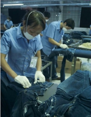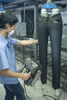三:臭氧氧化與傳統(tǒng)方法的優(yōu)缺點(diǎn)比較 1. 用次氯酸鈉(婆梅度為18度)經(jīng)濟(jì);不好控制,有傷布的纖維。健康危害:經(jīng)常用手接觸本品的工人,手掌大量出汗,指甲變薄,毛發(fā)脫落。本品有致敏作用。本品放出的氯氣有可能引起中毒。具腐蝕性,可致人體灼傷,具致敏性。 2. 用亞氯酸鈉和硫酸在加次氯酸鈉。價(jià)格比上一種高點(diǎn)。但比上一種好點(diǎn)。不傷布的纖維。亞氯酸鈉有強(qiáng)氧化性。在175℃時(shí)即分解而發(fā)熱,與可燃物質(zhì)接觸,即起猛烈爆炸,須注意安全。硫酸對(duì)環(huán)境有危害,對(duì)水體和土壤可造成酸性污染。具強(qiáng)腐蝕性、強(qiáng)刺激性,可致人體灼傷。 3. 高錳酸鉀、過醋酸和還原漂白方式 關(guān)于牛仔布漂白,除了用次氯酸鈉和亞氯酸鈉外,還可以用高錳酸鉀、過醋酸和還原漂白方式,具體需要根據(jù)牛仔布所用染料類型來選擇,傳統(tǒng)牛仔為還原淀籃染料,也有用硫化染料或直接染料代替,也有采用活性染料代替的,故此,需要根據(jù)具體情況考慮。 4. 臭氧氧化的優(yōu)點(diǎn) a) 無污染,臭氧為純凈物。在常溫下,易分解,生成氧氣和氧原子 b) 臭氧的氧化能力極強(qiáng)。 c) 運(yùn)行成本低 四:手工處理 1.手擦 a) 在洗水前,通過使用砂輪滾動(dòng)摩擦而使布面染料褪色,手擦的地方通常是脾位和臀位,人為的機(jī)械褪色,讓牛褲在洗水后顯得自然地懷舊和泛白 b) 噴沙和手擦效果接近,但對(duì)布紋的效果有差別。噴沙后布紋模糊,沉底,而手擦后布紋清晰凸顯