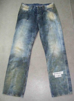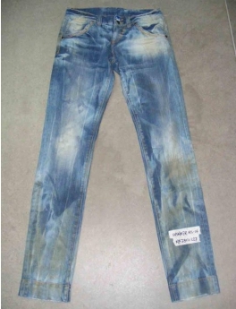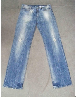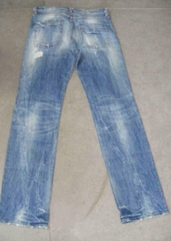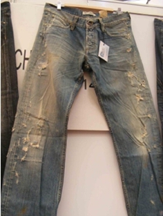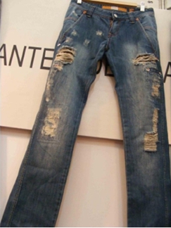 3.磨邊 磨爛 勾紗 將衣物在洗水前,人為地將褲腳,褲頭等一些特定部位用銳器刮爛,從而制成洗后的破爛懷舊效果