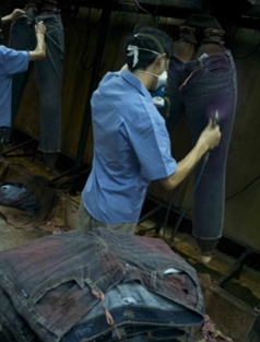 8.馬騮 噴一些氧化劑,一般是高錳酸鉀溶液,讓衣物局部褪色,從而讓牛褲顯得自然地懷舊和泛白